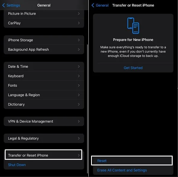 - Scroll down and tap on “Transfer or Reset iPhone”.