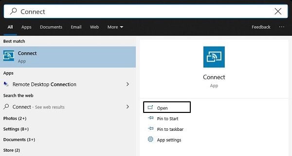 3. Open Connect App – Click on Windows Search Icon. Type Connect in the search bar and then click on “Open”. If using Windows 11, then do search for Wireless Display.