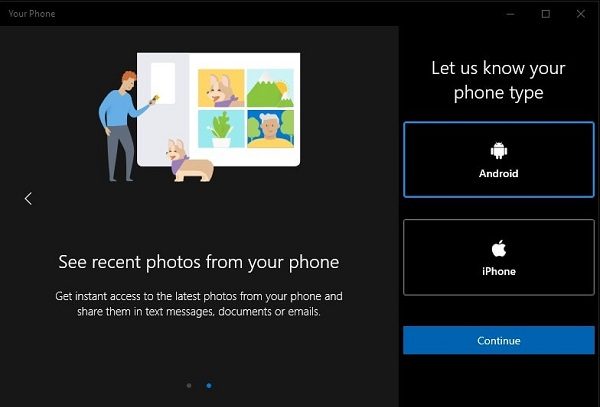 2. Your Phone App will now ask you to select Android or iPhone. Select it and click on Continue.