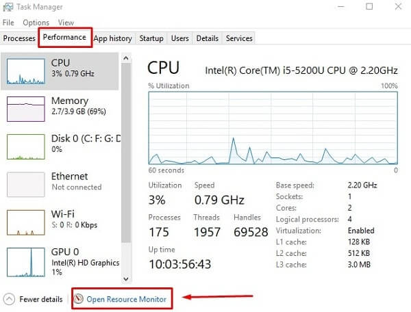 2. In Task Manager click on the Performance tab, Now at the bottom of the Performance tab, you will get the “Resource Manager” option click on it.